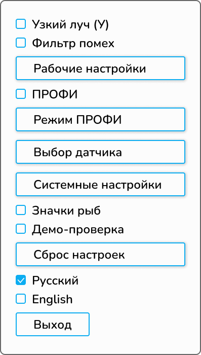 Однако разнообразие водоемов и условий ловли могут потребовать настройки прибора под конкретные задачи. Для этого в эхолоте есть разветвленное МЕНЮ настроек и регулировок.