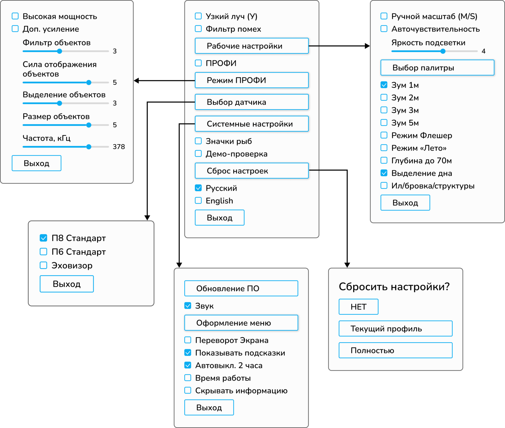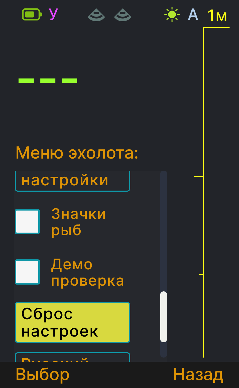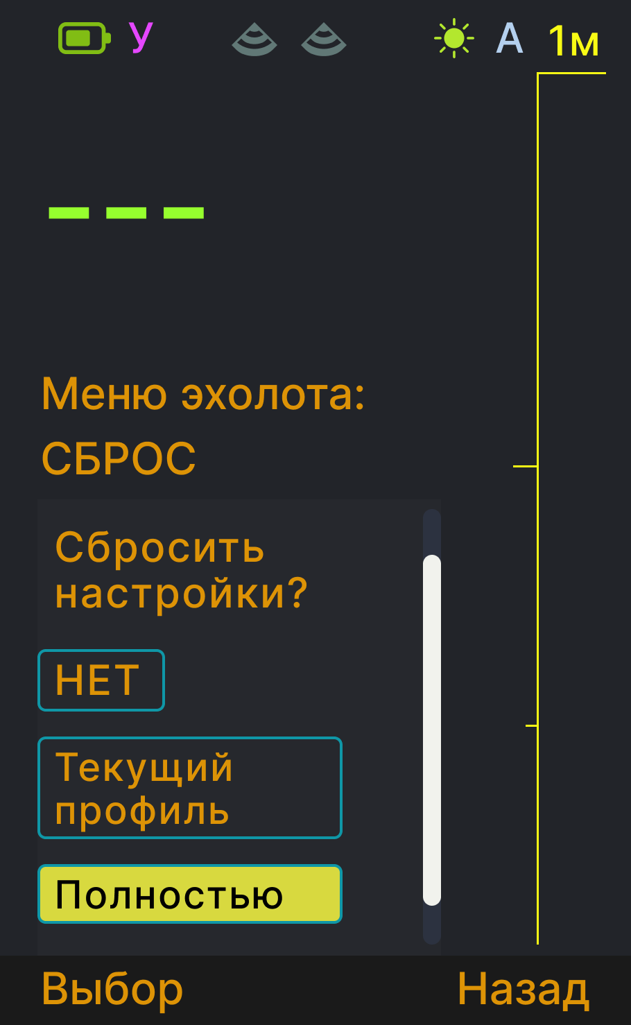 При выборе опции «текущий профиль» настройки эхолота в рабочем профиле сбрасываются до Заводских. При выборе опции «полностью» ВСЕ настройки эхолота сбрасываются до Заводских.